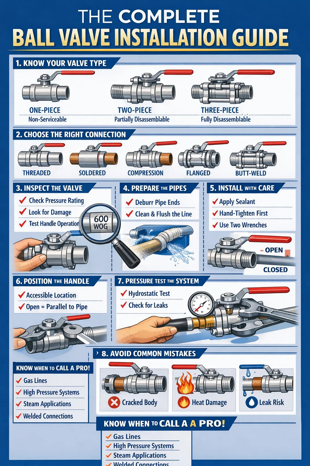 Las válvulas de bola están disponibles con extremos roscados (NPT o BSP), soldados (de sudor), de compresión, de ajuste a presión, bridados y soldados a tope. Cada uno requiere un método de instalación completamente diferente: