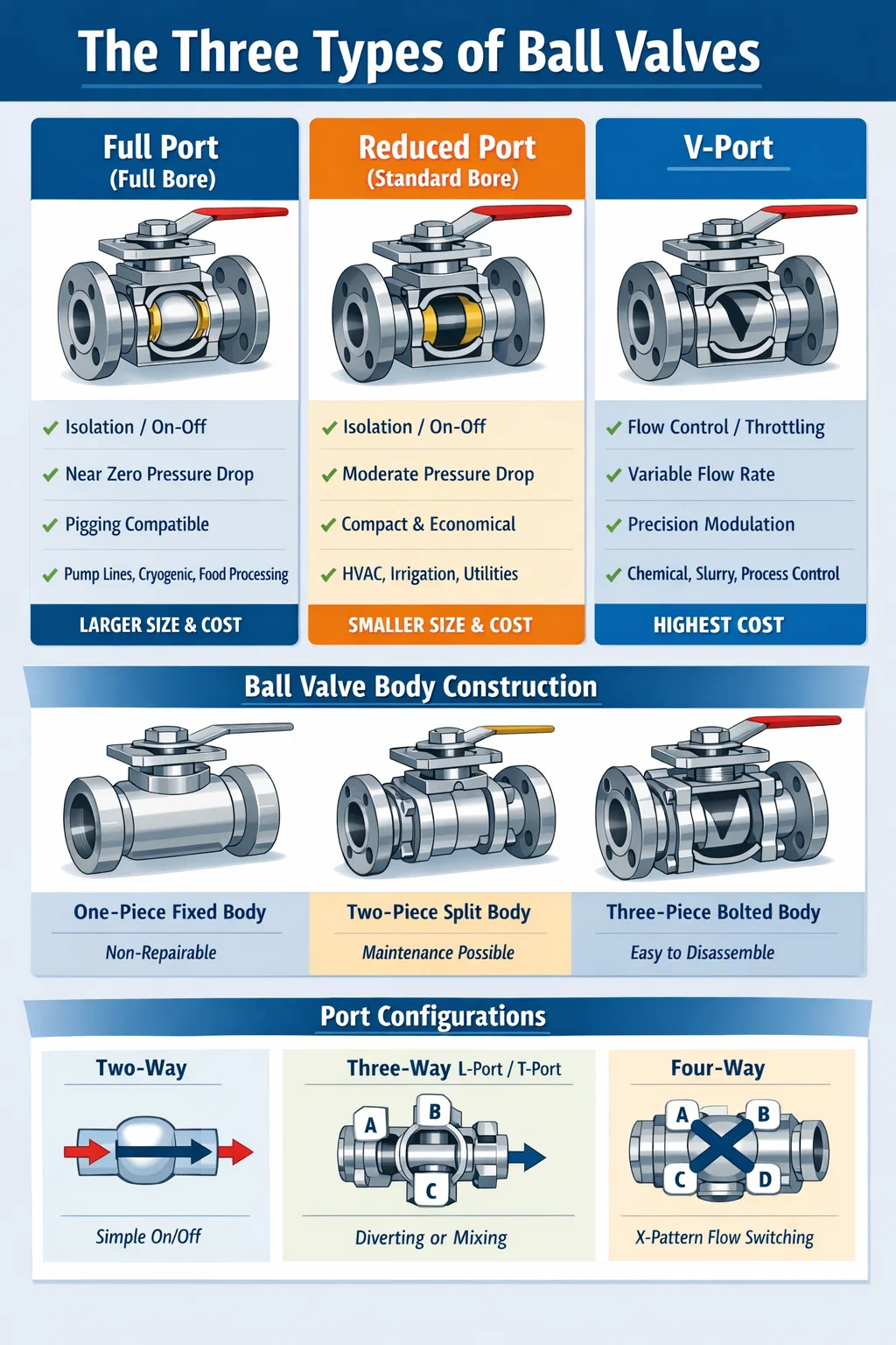 válvulas de bola se clasifican en tres tipos principales según el diseño de su orificio: Válvulas de bola de puerto completo (paso total), puerto reducido (diámetro estándar) y puerto en V . Cada tipo tiene distintos propósitos de control de flujo en sistemas de tuberías industriales, comerciales y residenciales. Comprender estas diferencias es esencial antes de seleccionar una válvula para cualquier aplicación, porque elegir el tipo incorrecto puede provocar pérdida de presión, restricción de flujo o falla prematura del equipo.