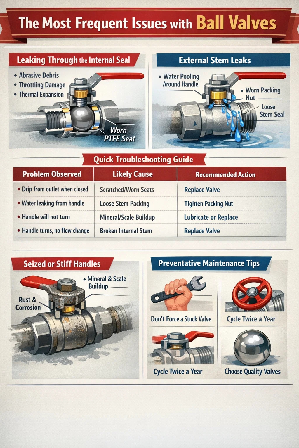 mientras válvulas de bola se encuentran entre los componentes de plomería más duraderos, fallan principalmente debido a fugas internas en el asiento, fugas en la empaquetadura del vástago o agarrotamiento de la acumulación de minerales. El signo más común de problema es que el agua continúa goteando incluso cuando la manija está en la posición completamente cerrada, o una manija que se niega a moverse después de meses de inactividad. Debido a que la bola interna está constantemente en contacto con el fluido, los desechos y las reacciones químicas son los principales culpables de estas fallas mecánicas.